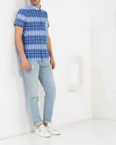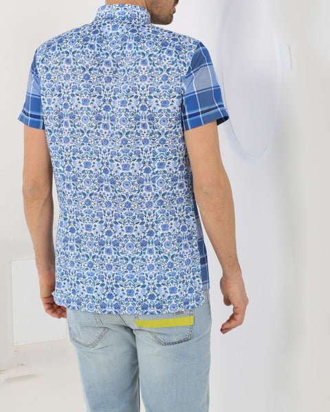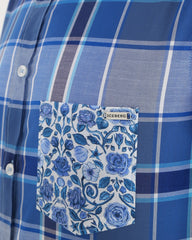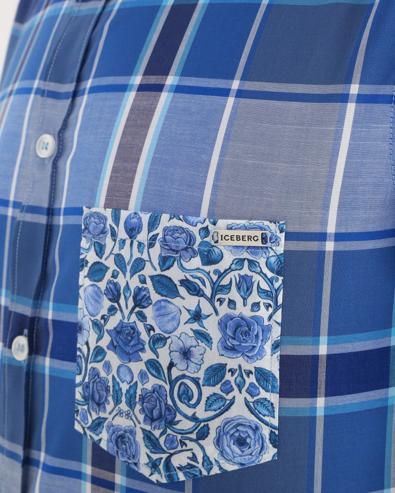 - All-over thick checks with patch floral pocket and shoulder paneling