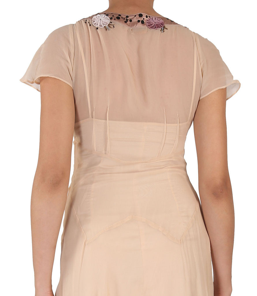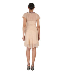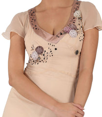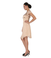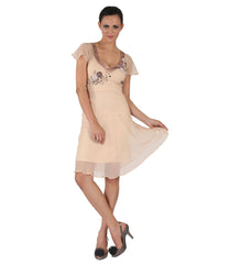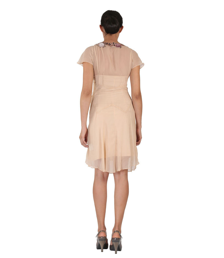 Galliano Beige Dress With Patch Work V Neck Cap sleeve Dress with a detachable under slip Concealed side zip closure