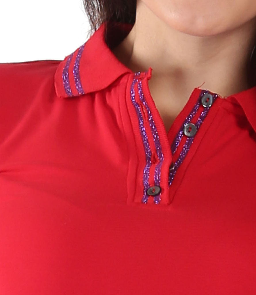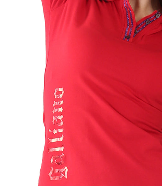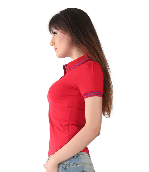 Galliano Red Collor T-Shirt Short sleeves logo detail at the hem Shimmery blue strip on the collar with button placket  Golden Galliano print on the side