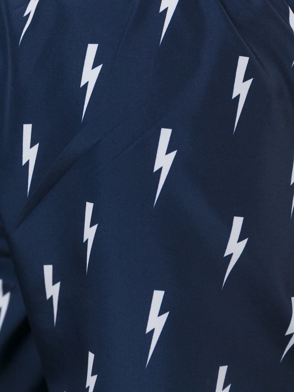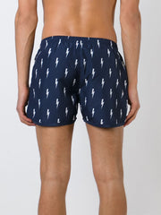 Navy blue and white lightning bolt swimming shorts Featuring an elasticated waistband with drawstring fastening Two inset pockets to the sides  Fall Winter 2016