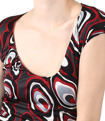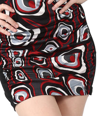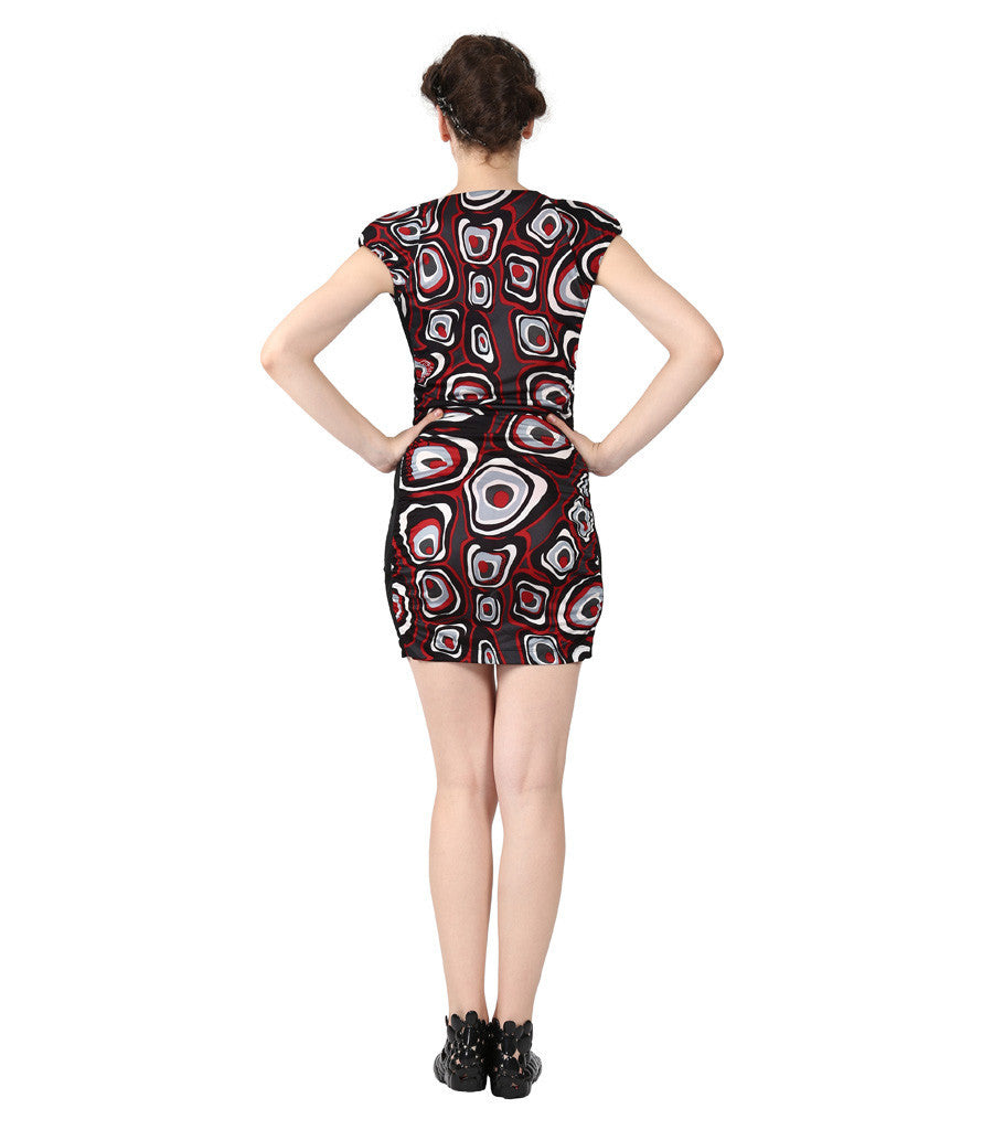 Bodycon mini dress is topped with a scoop neckline with plain black panels on the sides